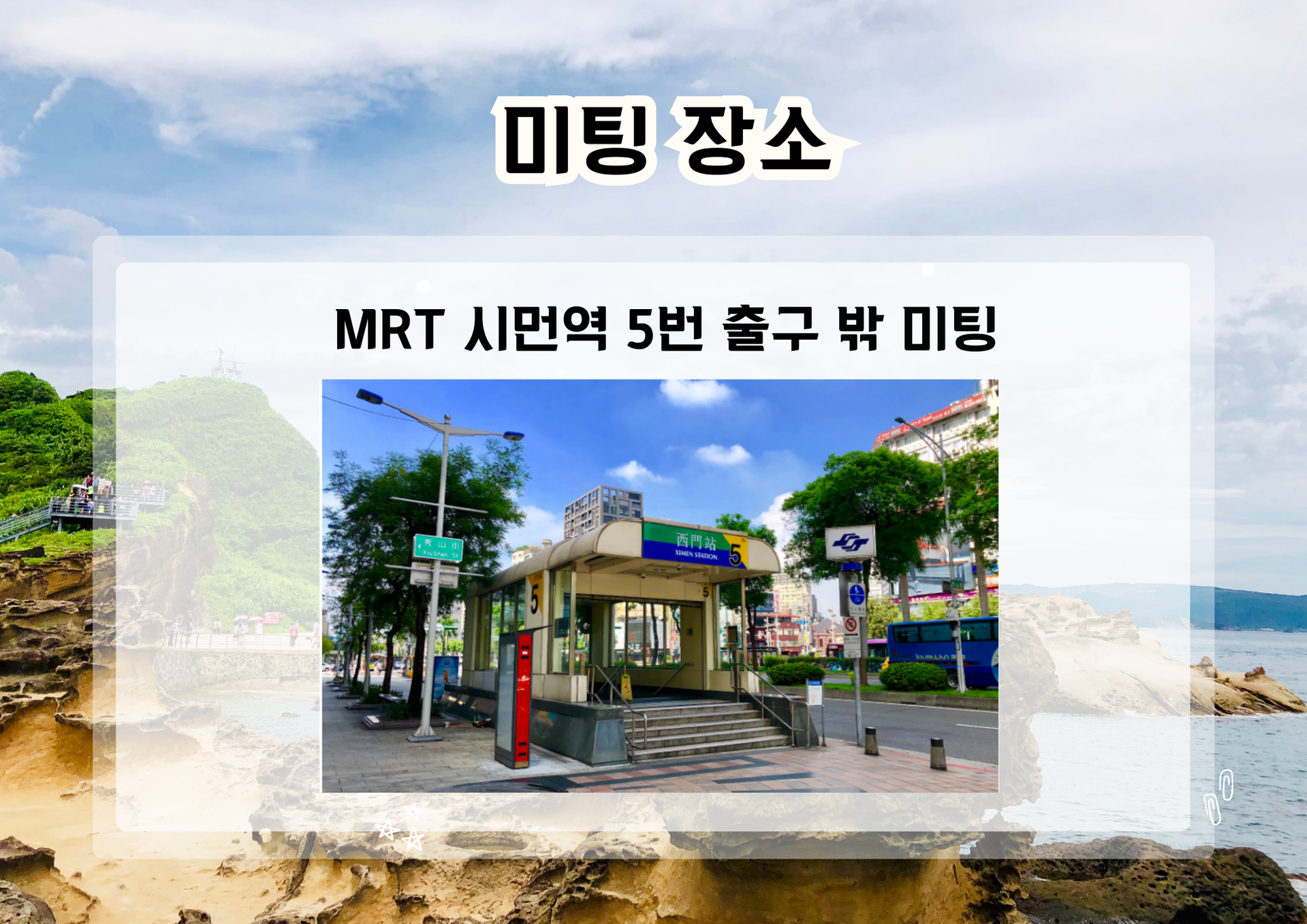 MRT 시먼역 5번 출구 밖 미팅 해당 업체에서 투어 출발일 하루 전 오후 18시 이후 미팅 장소 및 배정 가이드 정보를 메일로 발송해드립니다. 별도의 개별 연락을 드리지 않으니, 반드시 이메일을 확인하셔서 자세한 여행 정보를 받아보시기 바랍니다.