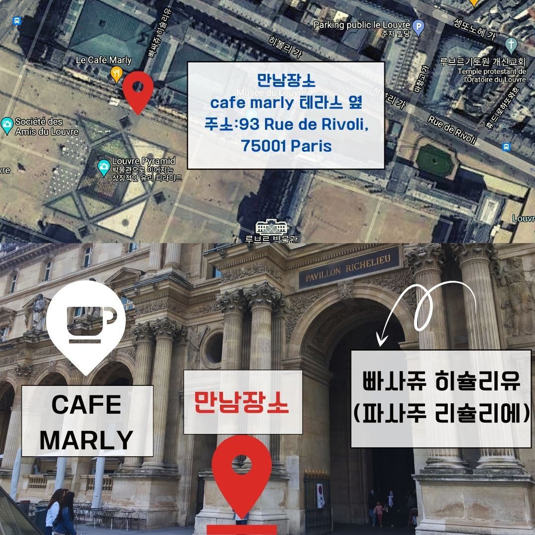루브르 유리 피라미드 입구 옆 빠사쥬 히슐리유 카페 마를리 앞 Le Café Marly : 카페 마를리 테라스와 빠사쥬 히슐리유 사이 기둥 https://maps.app.goo.gl/Dc6gcmhDKiHz9o259 Pyramide du Louvre 75001 Paris
