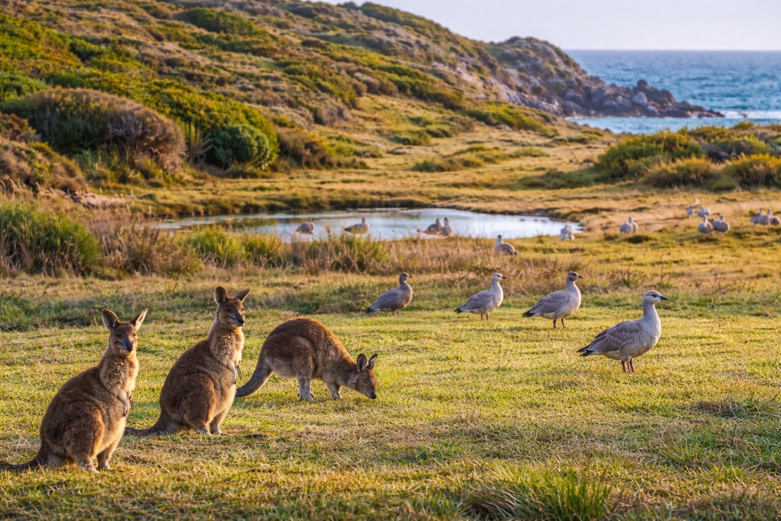 왈라비, 케이프바렌기러기 등 호주 고유 야생동물을 관찰합니다.