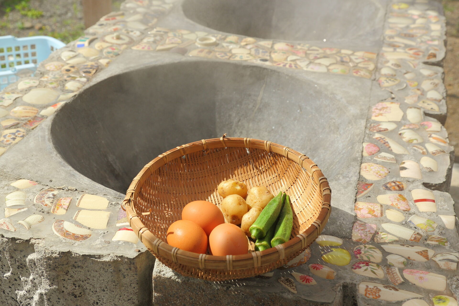 이부스키시에 있는 '장어 온천 스메히로바'에서는 지역산 식재료를 직접 쪄보는 체험을 할 수 있습니다. '스메'라고 불리는 약 90℃의 고온 증기로 찜을 체험할 수 있습니다.