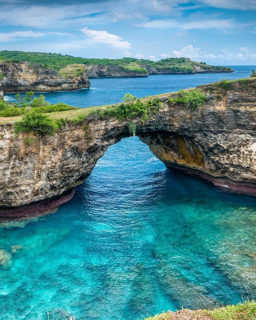 브로큰 비치, 또는 지역 주민들에게는 파시 우그로 알려진 이곳은 발리 누사 페니다의 남서쪽 해안에 위치한 아름다운 자연 지형입니다. 이곳은 수세기 동안의 침식으로 자연스럽게 형성된 거대한 바위 아치로 유명합니다. 바위 아치는 절벽에 난 구멍을 통해 바닷물이 들어오고 나갈 수 있는 원형 만을 만들어냅니다.