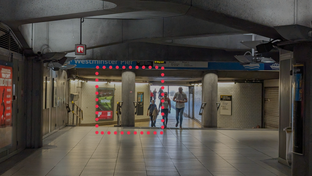 Westminster 지하철 역사 안에서 'Westminster Pier 방향 1/2번 출구' 쪽으로 나오는 통로 2개 기둥 중 왼쪽 기둥