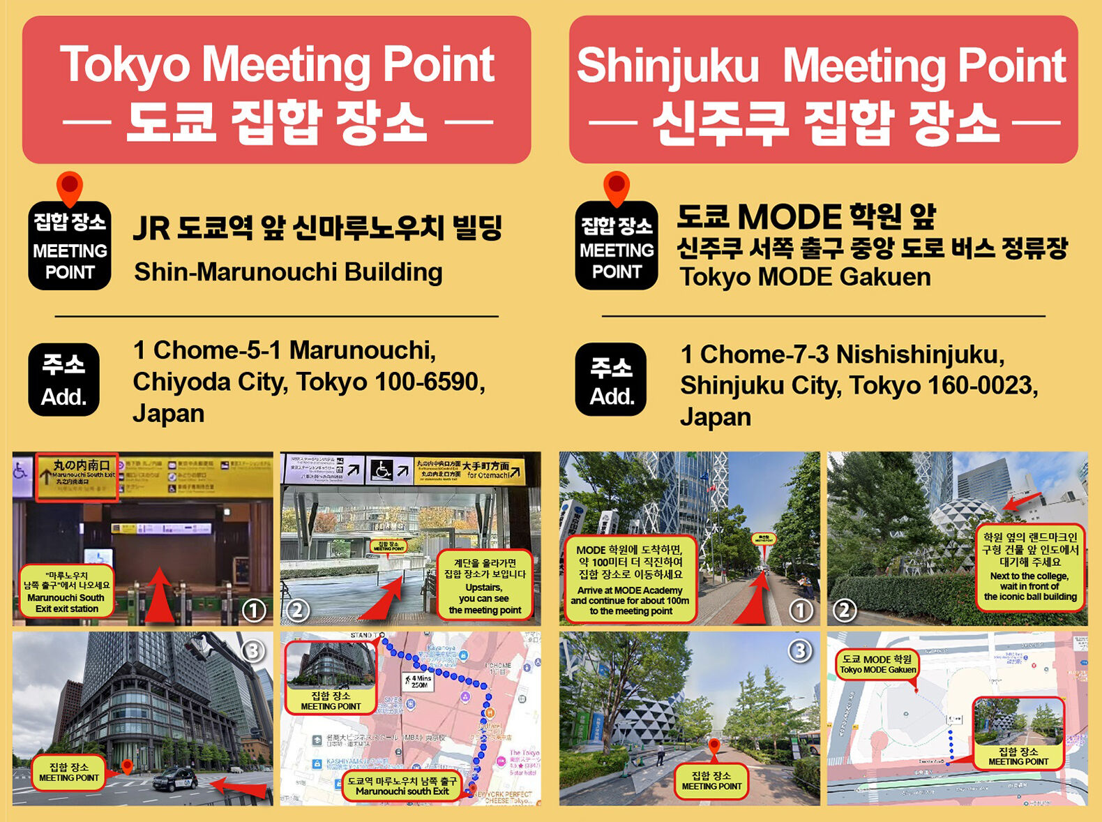 8:00AM:JR 도쿄역 앞 신마루노우치 빌딩 BEAMS 간판 아래,〒100-6590 Tokyo, Chiyoda City, Marunouchi, 1 Chome−5−1 新丸の内ビル 8:30AM:신주쿠 MODE 학원,TokyoMODEGAKUEN,1-7-3Nishi-shinjuku,Shinjuku-ku,Tokyo,160-0023Japan