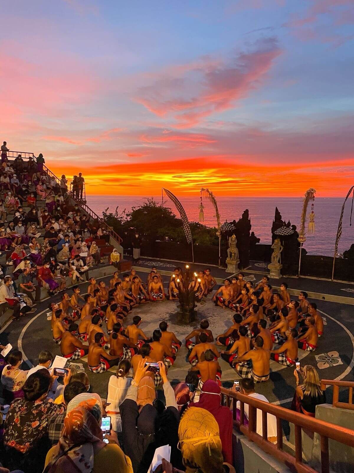 발리에서 가장 큰 사원인 울루와뚜 사원 절벽에서 최고의 일몰을 감상하세요. 케착 댄스는 오전 5시 30분과 7시에 시작됩니다. 5시 30분은 첫 번째 세션으로 가장 기대되는 시간입니다. 케착 댄스 관람 외에도 일몰을 감상할 수 있습니다. 두 번째 세션은 오전 7시에 시작하며, 케착 댄스만 관람할 수 있습니다. 따라서 투어의 우선순위인 첫 번째 세션 티켓을 구매하려면 일찍 오시는 것이 좋습니다.