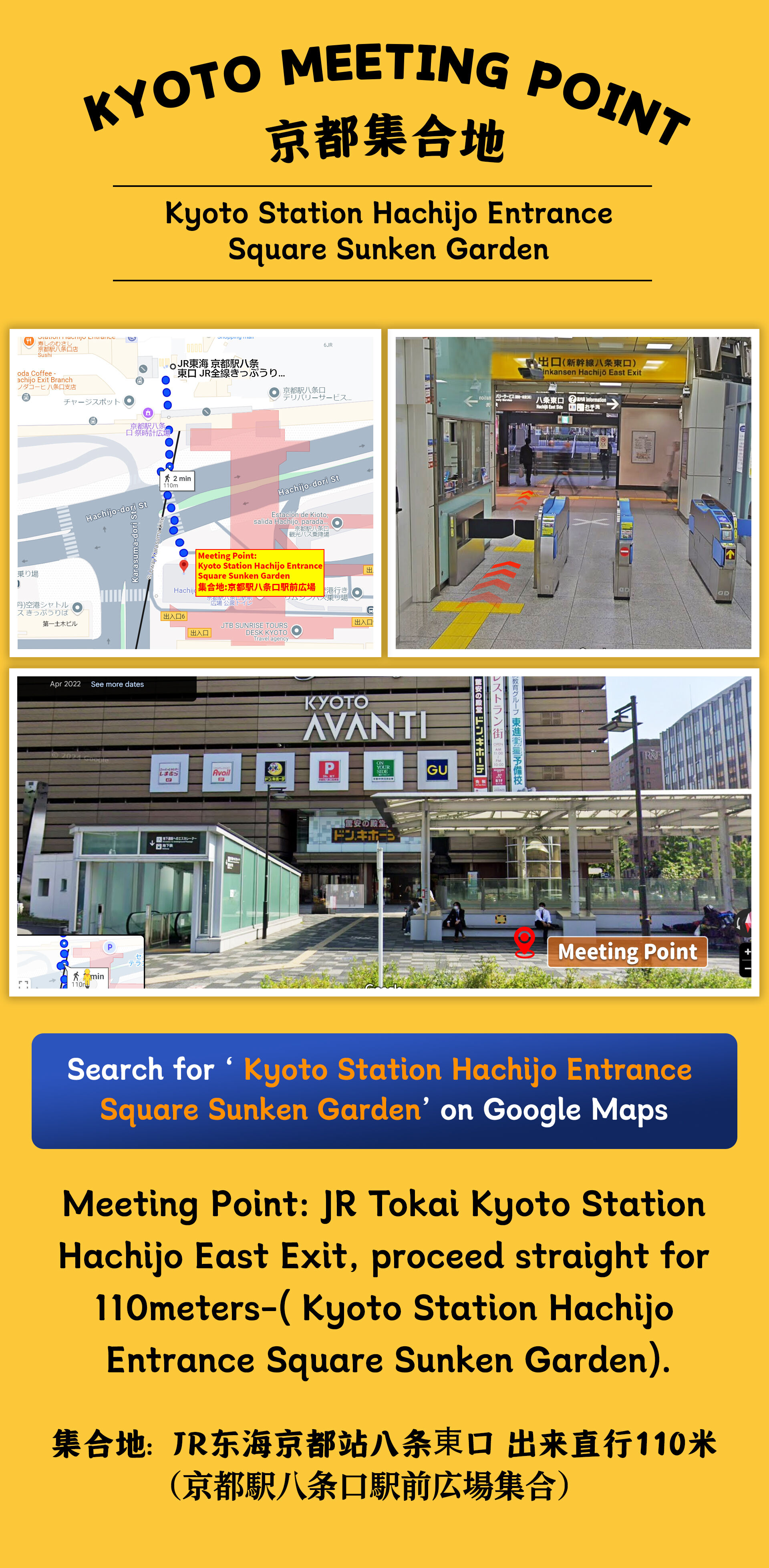 【오사카 출발】 7:50 모임 장소 도착, 8:00 정시 출발 오사카 근철 일본바시역 2번 출구 【교토 출발】 8:50 모임 장소 도착, 9:00 정시 출발 JR 도카이도선 교토역 8번 동출구 나와서 직진 110m