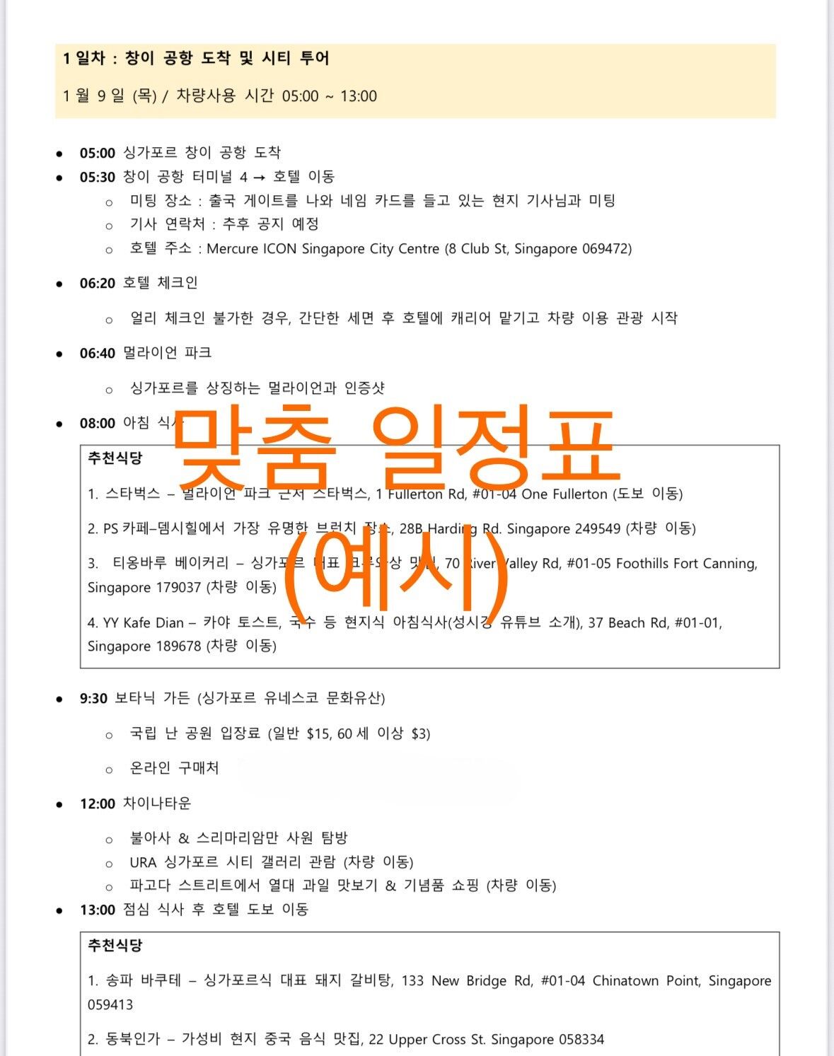 공항, 호텔 등 원하시는 출발 장소 (싱가포르 전 지역에서 출발 및 도착 가능)