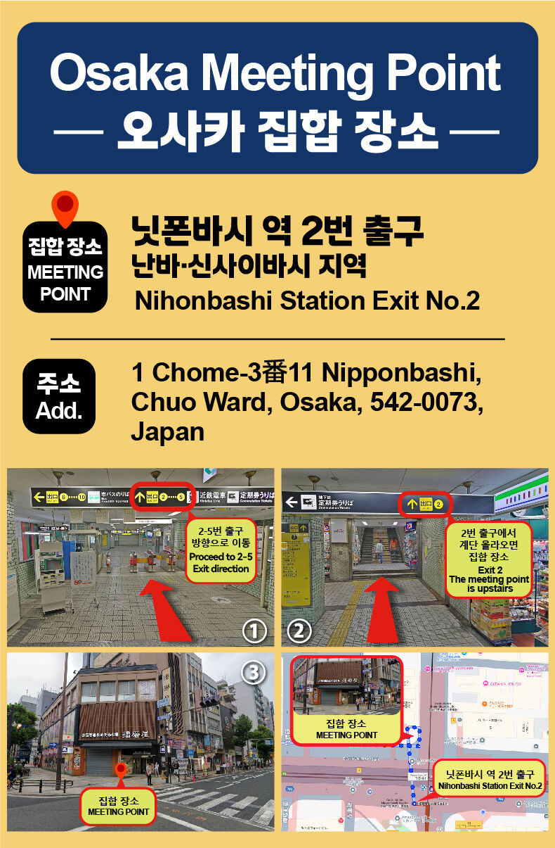 8:00-니혼바시 2번 출구(난바 신사이바시 지역) Address:1 Chome-3番11 Nipponbashi.Chuo Ward,Osaka,542-0073Japan