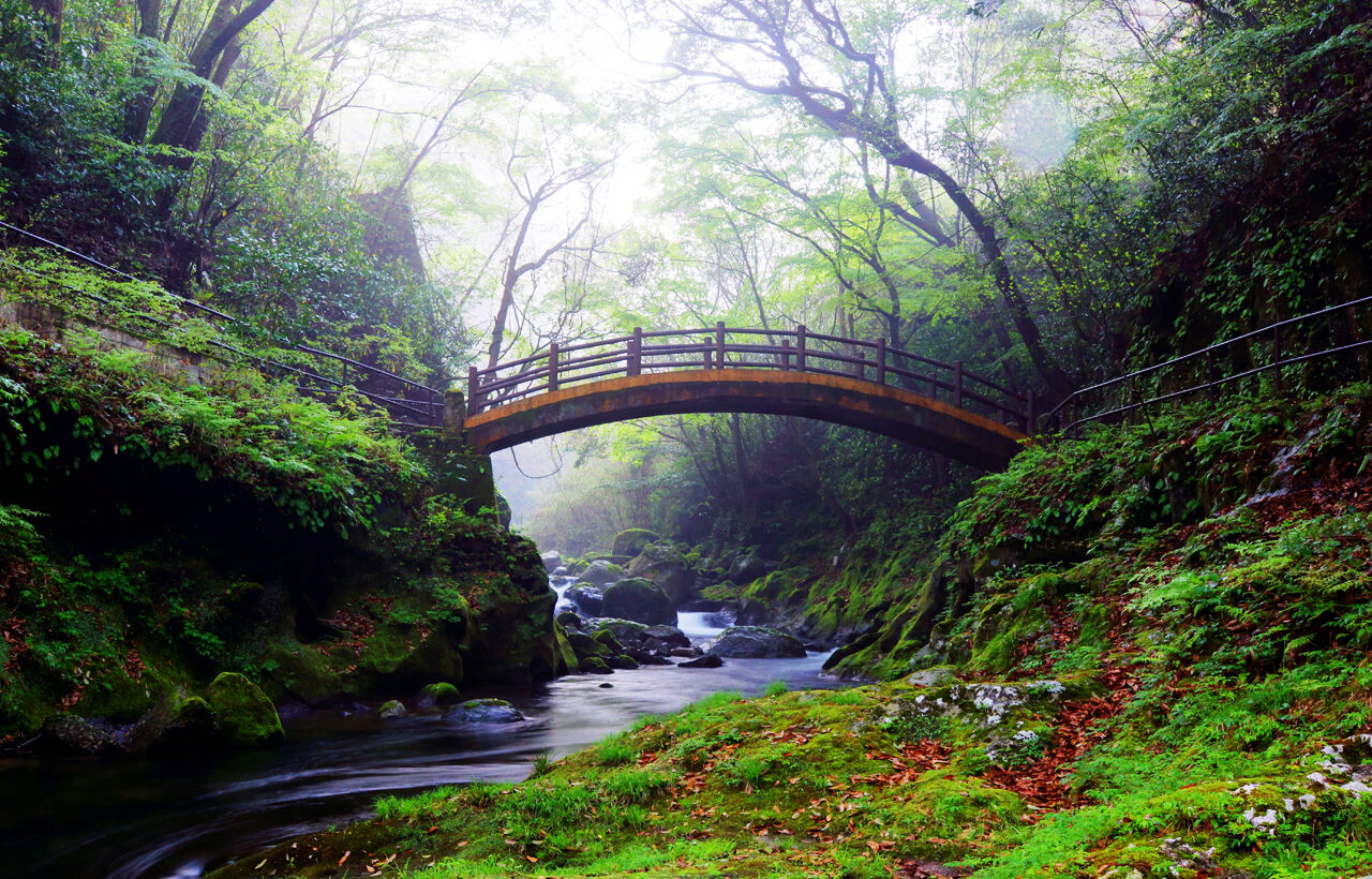 타카치호 협곡은 고대 아소 화산의 분화로 형성된 계곡으로, 양측의 단애와 17m 높이의 마나이 폭포가 특징입니다. 계곡 위로는 세 시대에 걸쳐 건설된 세 개의 아치형 다리가 나란히 서 있어 장관을 이루고 있습니다.