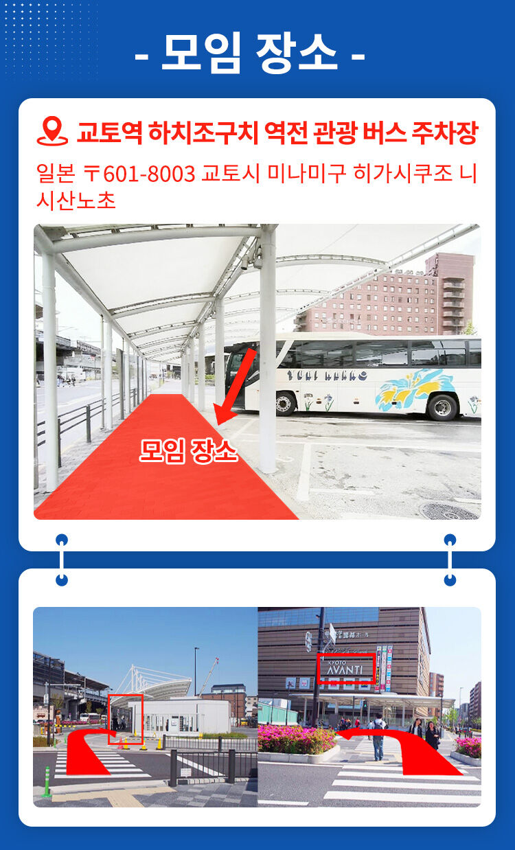 1.11:30 니혼바시역 2번 출구 (난바·신사이바시 지역) 주소:Nipponbashi 1-3-6, Chuo Ward, Osaka City, Osaka Prefecture 542-0073,Japan 2.12:40 교토역 하치조구치 - 역전 관광 버스 주차장 주소:Kyoto-HachijoguchiBus LoadingArea,HigashikujoNishisannocho,MinamiWard,Kyoto,601-8003Japan